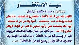 (عن شداد بن أوس رضي الله عنه عن النبي صلى الله عليه وسلم قال ( سيد الاستغفار أن يقول العبد اللهم أنت ربي لا إله إلا أنت ، خلقتني وأنا عبدك وأنا على عهدك ووعدك ما استطعت أعوذ بك من شر ما صنعت، أبوئ لك بنعمتك على وأبوئ بذنبي ، فاغفر لي فانه لا يغفر الذنوب إلا أنت ) من قالها في النهار موقناً بها فمات من يومه قبل أن يمسي فهو من أهل الجنة ومن قالها من الليل وهو موقناً بها فمات قبل أن يصبح فهو من أهل الجنة . أخرجه البخاري).
