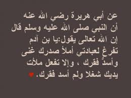 خواى گهوره له فهرموودهى قودسیدا دهفهرموێت: (يَا ابْنَ آدَمَ تَفَرَّغْ لِعِبَادَتِي أَمْلَأْ صَدْرَكَ غِنًى وَأَسُدَّ فَقْرَكَ وَإِنْ لَمْ تَفْعَلْ مَلَأْتُ صَدْرَكَ شُغْلًا وَلَمْ أَسُدَّ فَقْرَكَ)( رواه ابن ماجه: (2/1376) وأحمد: ٢/٣٥٨, صحیح الترغیب والترهیب: ٣/٣١٦٦, جامع الصحیح: ١٩١٤. )