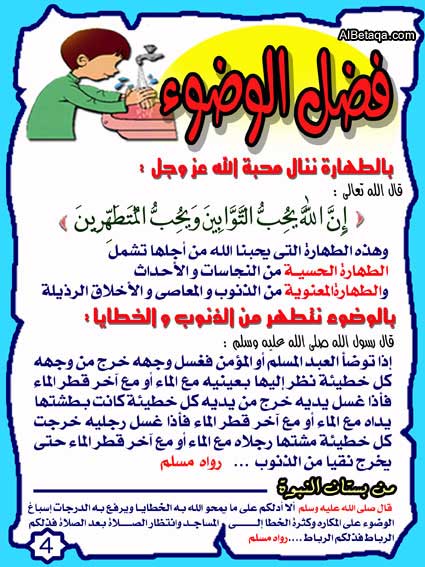 * پێغهمبهرى خوا صلى الله علیه وسلم دهفهرموێت: (وَلَنْ يُحَافِظَ على الوُضُوءَ إلاَّ مَؤمِنٌ..) . واته : تهنها ئیماندار پارێزگارى له دهستنوێژ دهکات..