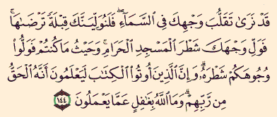 واتای ئایهتی (قَدْ نَرَى تَقَلُّبَ وَجْهِكَ فِي السَّمَاءِ فَلَنُوَلِّيَنَّكَ قِبْلَةً تَرْضَاهَا ....)(البقره144)