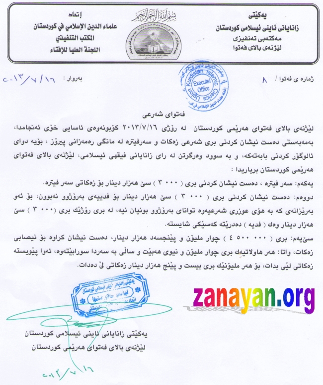 ئەمەی خوارەوە دەقی فەتواكەیە (ئةم لينكة بكەوة بة كوبي):