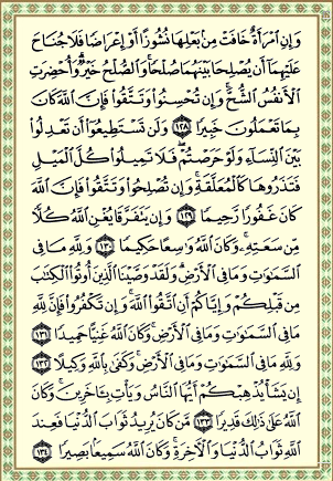ئایهتهکه : (أبو داود) و (حاكم) له (عائشة) ى دایکى موسوڵمانانهوه دهگێڕنهوه،دهڵێت : کاتێک (سودة)ى خێزانى پێغهمبهر (د.خ) بهساڵاچوو دهستبهردارى نۆبهو ڕۆژى خۆى بوو وتى : ڕۆژهکهى خۆم دهبهخشم به (عائيشة) ، پهروهردگاریش