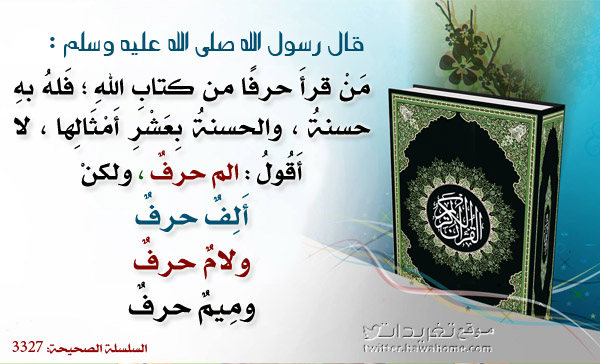 (عن عبدالله ابن مسعود) عن النبی(ص) قال:"من قرأ حرفا من کتاب الله فله به حسنه,والحسنه بالعشر أمپالها،لا أقول الم حرف ولکن الف حرف ولام حرف ومیم حرف))((رواه الترمدي)).