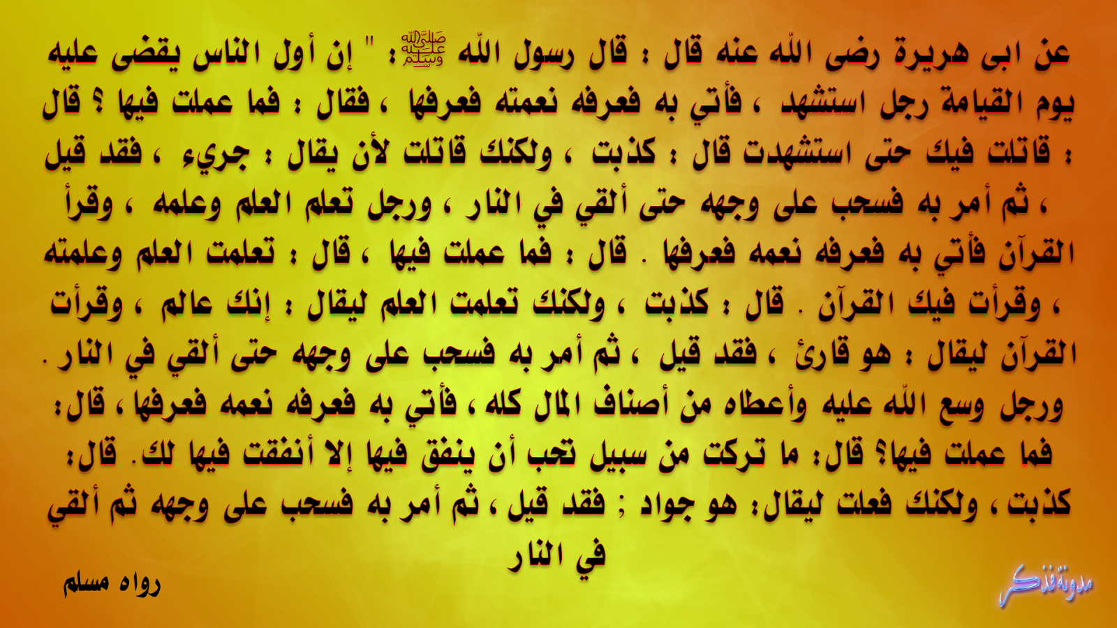 (أخرج الإمام مسلم في صحيحه بسنده عن سليمان بن يسار قال:تفرق الناس عن أبي هريرة فقال له ناتل أهل الشام: أيها الشيخ حدثنا حديثا سمعته من رسول الله صلى الله عليه وسلم, قال:نعم سمعت رسول الله صلى الله عليه وسلم يقول: (إن أول الناس يقضى يوم القيامة عليه رجل استشهد فأتى به فعرفه نعمه فعرفها, قال: فما عملت فيها؟ قال: قاتلت فيك حتى استشهدت, قال: كذبت, ولكنك قاتلت لأن يقال جريء, فقد قيل, ثم أمر به فسحب على وجهه حتى ألقي في النار, ورجل تعلم العلم, وعلمه, وقرأ القرآن فأتي به فعرفه نعمه فعرفها, قال: فما عملت فيها؟ قال: تعلمت العلم وعلمته, وقرأت فيك القرآن, قال: كذبت ولكنك تعلمت العلم ليقال عالم, وقرأت القرآن ليقال هو قارئ, فقد قيل, ثم أمر به فسحب على وجهه حتى ألقي في النار, ورجل وسع الله عليه, وأعطاه من أصناف المال كله فأتى به فعرفه نعمه فعرفها, قال: فما عملت فيها؟ قال: ما تركت من سبيل تحب أن ينفق فيها إلا أنفقت فيها لك, قال: كذبت ولكنك فعلت ليقال هو جواد فقد قيل ثم أمر به فسحب على وجهه ثم ألقي في النا)