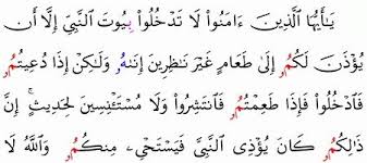 [ يا ايها الذين امنوا لا تدخلوا بيوت النبي الا ان يؤذن لكم الى طعام غير ناظرين اناه ولكن اذا دعيتم فادخلوا فاذا طعمتم فانتشروا ولا مستأنسين لحديث ، ان ذلكم كان يؤذي النبي فيستحي منكم و الله لايستحي من الحق ، واذا سألتموهن متاعاً فاسألوهن من وراء حجاب ذلكم أطهر لقلوبكم و قلوبهن ، وما كان لكم أن تؤذوا رسول الله ولا أن تنكحوا أزواجه من بعده أبداً ان ذلكم كان عند الله عظيماً ، ان تبدوا شيئاً أو تخفوه فان الله كان بكل شئ عليماً ] الاحزاب /٥٤ .