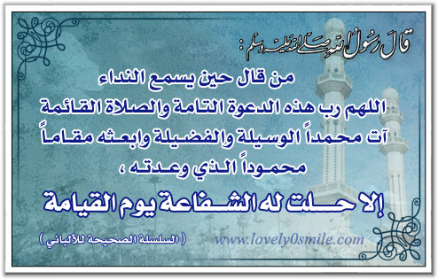 (إِذَا سَمِعْتُمُ الْمُؤَذِّنَ فَقُولُوا مِثْلَ مَا يَقُولُ ثُمَّ صَلُّوا عَلَىَّ فَإِنَّهُ مَنْ صَلَّى عَلَىَّ صَلاَةً صَلَّى اللَّهُ عَلَيْهِ بِهَا عَشْرًا ثُمَّ سَلُوا اللَّهَ لِىَ الْوَسِيلَةَ فَإِنَّهَا مَنْزِلَةٌ فِى الْجَنَّةِ لاَ تَنْبَغِى إِلاَّ لِعَبْدٍ مِنْ عِبَادِ اللَّهِ وَأَرْجُو أَنْ أَكُونَ أَنَا هُوَ فَمَنْ سَأَلَ لِىَ الْوَسِيلَةَ حَلَّتْ لَهُ الشَّفَاعَةُ) . واته: کاتێ گوێتان له بانگ بوو بانگبێژ چی فهرموو ئێوهش ئهوه بڵێن, پاشان سلآواتم لهسهر بدهن, چونکه ههر کهسێ سلآواتێ لهسهر من بدات خواى گهوره ده جار رهحمهت دهڕێژێت به سهریا, داواى (الوسيلة)م بۆ بکهن که مهنزڵگایهکه له بهههشتدا دانراوه بۆ یهکێک له بهنده ههڵبژێردراوهکانى خوا, هیوادارم که من بم, ههرکهسێ داواى (الوسيلة)م بۆ بکات شهفاعهتى من بۆ ئهو حهلآڵ دهبێ.