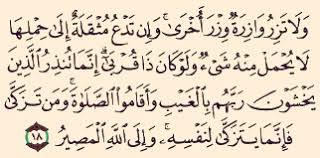 تێبینى : [ وان تدع مثقلة الى حملها لا يحمل منه شئ ولو كان ذا قربى ] نموونهى ئافرهتێکى سک پڕه که قورس بووه بهسکهکهیهوه و ناڕهحهته ، ههروهک چۆن نزیکترین کهسى ناتوانێ بارهکهى لهسهر شان سوک بکات ، ئاوههاش ههر کهس بارى خۆى بهسهر شانى خۆیهوهیهتى لهڕۆژى قیامهت دا و ههرکهس به قولهپێى خۆى ههڵدهواسرێ !