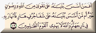 واتای ئایهتى......{أَفَمَنْ أَسَّسَ بُنْيَانَهُ عَلَى تَقْوَى مِنَ اللّهِ وَرِضْوَانٍ خَيْرٌ أَم مَّنْ أَسَّسَ بُنْيَانَهُ عَلَىَ شَفَا جُرُفٍ هَارٍ فَانْهَارَ بِهِ فِي نَارِ جَهَنَّمَ وَاللّهُ لاَ يَهْدِي الْقَوْمَ الظَّالِمِينَ }التوبه 109
