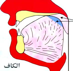 ٢- ئهوپهڕی زمان کهمهک له دوای مهخرهجی (ق) واته کهمهک بۆ لای دهم دآ لهگهل بهرامبهری له مهلآشوو ئاسمانهی سهرووی دهم مهخرهجی پیتی (ك)ه