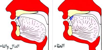 ٨-پێشهوهی زمان (طرف اللسان) ( 2) لهگهل رهگی دوو ددانی سهرهوهی لای پێشهوه شوێنی دهرچوونی سآ پیته (ت، د، ط)